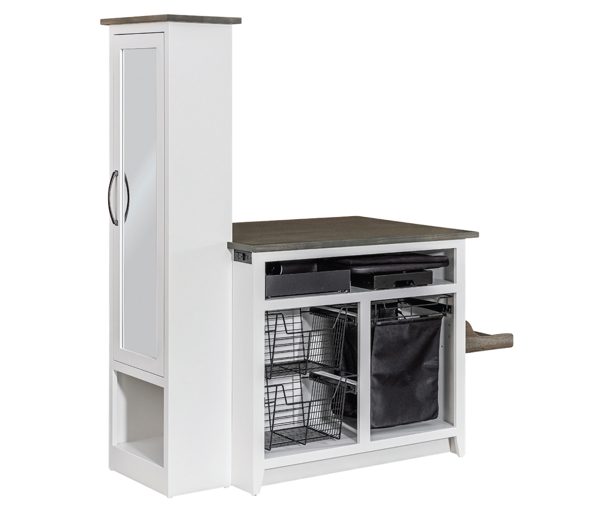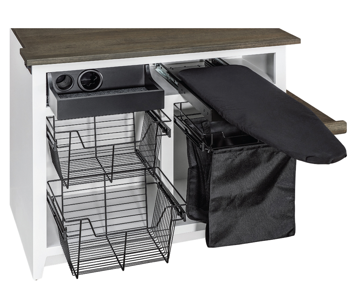 Features: • Shoe rails on one side • Hair dryer and straightener storage • Wire basket pullouts • Iron board • Hamper pullout